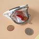A rice ball-shaped mini-gamaguchi made by dyeing canvas with silk screen technique.