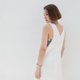 圆领洋装,侧边拼接缇花布,背后为深V领设计。提供两种颜色选择:白色与深灰色。