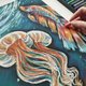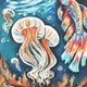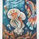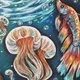 “海底世界的水母”。油画棒《海底世界》系列的四幅作品之一。