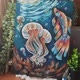 水母周围环绕着美丽的藻类和花朵,给人一种水下花园的印象。水中充满了光影的变化。这幅画的背景就像一个水下王国,和平与安宁。这幅画的整体印像是明亮多彩的,让观者感觉自己就像是这个令人惊叹的海底世界的一部分。