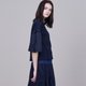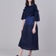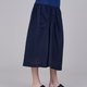 以异材质面料剪接设计之长裙裙款,精致棉质面料与半透明格纹刺绣布料做剪接,右前片裙摆以立裁方式抓褶车缝,创造出不规则的立体效果。裙摆格纹的面料以3D渐层刺绣制作,展现了布料的细致工艺。此裙款可搭配丈青色水袖上衣或衬衫款式都能创造出知性又优雅的造型。