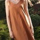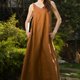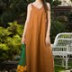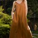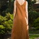 A copper linen dress featuring loose silhouette, one shoulder twist, and a maxi length.