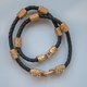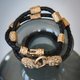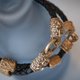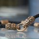 双手链,黑色编织皮绳上饰有黄铜狼头和符文,维京时代风格。这款手镯献给陪伴奥丁神的狼 Geri 和 Freki。在古挪威语中,Geri 的意思是“贪婪”,Freki 的意思是“贪吃”。狼吃众神之父大厅里餐桌上的食物,而奥丁本人不吃食物,只品尝酒。