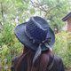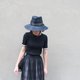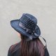使用台湾在地生产的线材,拉菲草手工制作,帽顶中间设计凹陷,是费多拉帽的经典特色,帽深处设计篓空的织纹,让沈稳的黑色利用织纹的变化增加层次感,最后搭配上有镶着微微闪烁的银色线条缎带,使帽子中性却又带一点温柔。