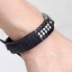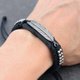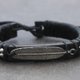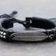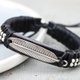 这是一款手工串珠手链,由棕色皮革带与银盘珠编织而成。