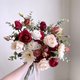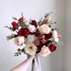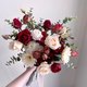 花材:深红庭园玫瑰、红玫瑰、深红陆莲、杏色玫瑰、白色含苞玫瑰、砖红迷你玫瑰、迷你玫瑰、太阳花、尤加利叶。