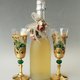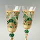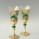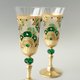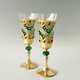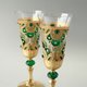 - Exquisite, hand painted and decorated champagne or white wine glasses, set of 2. Impressive royal emerald green and gold appearance with a whiff of the art of the East. Rich gradations of gold, antique gold and bronze. Gold plating imitation with distress effect on the base and stem. Decorated with Emerald Swarovski Crystals and crystal rhinestones.