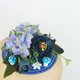 以蓝色巴塔草编织为基底,缀以深油蓝色毛茛花、浅蓝色绣球花、蘑菇与绿叶。