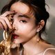 画中女子象征着紫水晶,她好似慵懒的伸懒腰并挑起美丽的金色秀发,展现紫水晶神秘又内敛的优雅气质,缎面淡紫色的裙摆外,环绕着象征着希腊神话中彩虹女神的鸢尾花 Iris,带有沈静、与智慧的氛围。