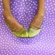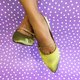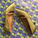 用本色绣花是一次新的尝试,在金色的制鞋丝绸上绣制金色的梅花,丝绸面料原有的光泽,映衬出细致的梅花,花朵在金色上时隐时现,花型随着鞋型的弧度转折着,勾勒出鞋身的优雅。