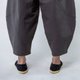 双弯刀立体剪裁技法,从大腿处微微外扩,膝下达到最宽松的廓形,于脚踝前优雅收窄,勾勒出如弯刀般流畅的弧线。