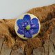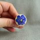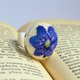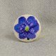 绣有蓝色花朵的手工戒指。 图案是我设计的,也是我绣的。 我在每幅刺绣图片中使用最大数量的颜色,使其更加逼真和丰富多彩。 这枚戒指看起来很温柔。 这朵花是用棉绣线绣在亚麻布上的。 细节: - 圆形为 25x25 毫米(1x1 英寸); - 材质:黄铜环底座、棉、麻; - 戒指是可调节的。