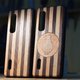 工艺师运用木工技术,将不同木质一片一片手工镶嵌于手机壳上,形成间条状