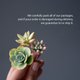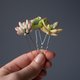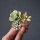 一组三支精致的发簪,点缀着拟真的多肉植物:'Peach Pride' 拟石莲、'Nussbaumerianum' 景天和果冻豆景天。是新娘的完美婚礼发饰!