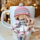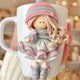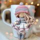 A little girl with beige hair wearing a white outfit and a beanie holding a frappe drink.