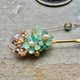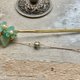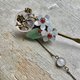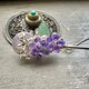 簪头平安扣为略带紫色的玛瑙,叶片由非洲翠雕刻而成,花朵则以捷克制琉璃串成,所有金属皆为铜质