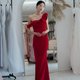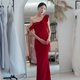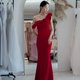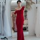 不对称的荷叶边袖,露出的半肩既不过度亦不失优雅,合身的鱼尾裙摆设计更展现出曲线,推荐于演奏会、婚礼敬酒、正式社交场合的晚礼服。