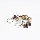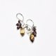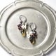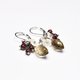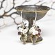 Earrings with smoky quartz, garnet, florets of white pearl oysters, moss agate, and small bells.