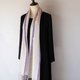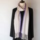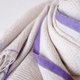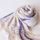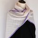 这是一条柔和的象牙白色简约披肩,但两端的鲜艳紫罗兰色线条,更衬托出蕾丝织纹的通透感与暗纹设计。由于其轻薄且极致轻盈,即使是喀什米尔材质,夏季也可摊开作为冷气房的保暖使用。除了春季与秋季,冬季围在颈间,更能为容易显得厚重的穿搭增添脸部周围的明亮感。此外,由于混纺丝绸,带有高雅的光泽与华丽感,亦推荐于婚礼或派对等正式场合配戴。