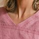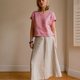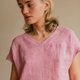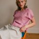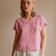 ㄧ件简约的亚麻小包袖上衣,布有着丰富的色织纹理,在领口袖口胸上处做粗车线设计,让上衣更加细致。