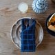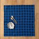 在FINE LITTLE DAY的 Rutig 图案中镶嵌两张提花编织亚麻餐巾,手绘线条赋予经典图案以生命力。采用强烈、大胆的色彩组合 - 黑色和蓝色。