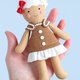 图案包括逐步照片说明和全尺寸图案片,用于制作两个布娃娃:姜饼男孩和姜饼女孩。这些柔软的东西是我的圣诞系列的一部分。娃娃的身体也使用相同的图案。女孩穿着一件带有白色糖霜褶边的连身裙,顶部有糖霜饰边,前面有一个扣环。男孩穿着领口有蝴蝶结的连身裤,腰部有白色糖霜饰边,前面有一个扣环。两件衣服均采用全衬里并采用按扣闭合。此外,连身裙的背面用钩环带闭合,方便穿着。这些娃娃可以轻松放入口袋中,非常适合散步或旅行时携带。请注意:如果没有支撑,娃娃无法站立。