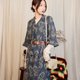 ●**F03 透肤印花 蓝色**/ V领,背部拉链式,腰际弹性可伸缩,雪纺布料,上身透肤无内衬,无明显瑕疵。