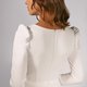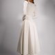 A字廓形、方领设计的皱织婚纱 Camilla。这款全长及膝的婚纱,配有长袖和自然腰线。