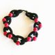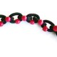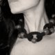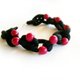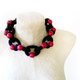 Crochet chain necklace - modern choker sculpture made out of 15 tubular jump rings using 25% linen and 75% viscose black yarn. Beaded with wooden ball beads in dark cyclamen color. Closes with silver tone metal toggle and crochet loop.