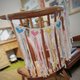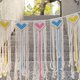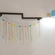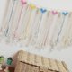 米白色长帘一长串共八组爱心,以粉红、粉蓝、黄色穿插组成,每组间距3公分,平直拉开约77公分宽,间距可自行调整,长度约25公分至40公分不一,呈现活泼自然的垂坠感,左右二侧各保留60cm较长绑绳,方便您自行吊挂固定。