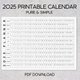 简单水平 2025 年日历、2025 年可打印日历、2025 年日历、数位下载