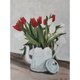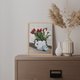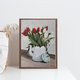 在画布的中心,明亮的色调在表面舞动,为用丙烯酸颜料描绘的如画场景注入了生命。构图的中心是一个古老的白色珐琅茶壶,它的复古魅力为这幅画增添了怀旧气息。茶壶里盛开着一束红白相间的郁金香,花瓣在优雅的舞蹈中展开。每朵花都细致入微,每一笔都充满活力,传达出花朵的细腻质感和丰富的色调。红色郁金香大胆而热烈,与白色郁金香形成鲜明对比,它们的色彩交织在一起,形成了一曲美丽的交响曲。茶壶的简洁优雅和郁金香的明亮魅力装饰了这幅画,邀请观众沉浸在这一时刻永恒的美丽中。