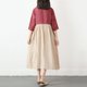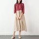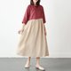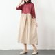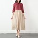 不仅颜色不同,使用的材质也不一样,上半身是苎麻材质,下半身是棉麻材质。不同材质有不同的肌理和触感,穿着时的感受应该会更加丰富。