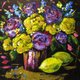 原创压克力画,中等尺寸。 画在画布板上。采用手工制作的浅金色木质框架。 花瓶里的紫色、蓝色、黄色花朵和黑色背景上的柠檬,带有金色的口音。 标题“花束和柠檬” 只有 DaiCeSa 的原创艺术。