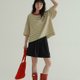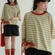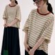 米白色 彩色領口條紋撞色短袖T恤 復古文藝休閒百搭寬松圓領上衣