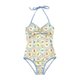 基础版型连体泳衣,正面胸前有抽皱,形成小v领。