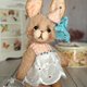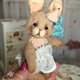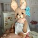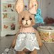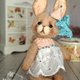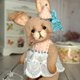 兔子站立时高 11 厘米,坐着时高 9 厘米(不含耳朵)。将电线插入耳朵中,您可以将它们弯曲到任何位置。我为兔子手工制作了一件裙子,有衬里的紧身胸衣,用两个纽带固定,还有一顶带蝴蝶结的帽子。