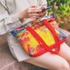 此帆布包以16盎司厚白色帆布袋采热升华印制,手提把有黑色,红色,黄色及土耳其蓝共四色,缝制磁扣,内部有一小内袋,布包两侧有缝制扣环,方便置换成斜背带。