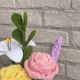 花瓶、花痴、纱线、钩针编织有玫瑰、百合、康乃馨、雏菊、薰衣草和桉叶。