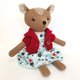 马鹿女孩毛绒玩具,高度 - 32 厘米(13 英寸),羊毛法兰绒,防过敏合成填充物。棉质碎花连衣裙或草莓连衣裙(购买前选择一件或两件连衣裙)和红色针织开衫。绣有眼睛和鼻子。所有衣服均可脱卸。如果您想要其他衣服 - 请联系我。