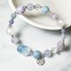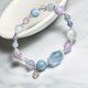 采用原矿切面的海蓝宝、搭配果冻般的蓝纹玛瑙、紫水晶、饱和的丹泉石,不同浓度与透度的蓝与紫,铺垫出层层叠进的蓝紫色倒影,搭配月光石的光辉,仿佛落日的流光在云霞间渲染漫舞着。
