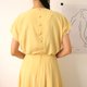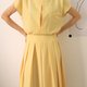 Summer-weight tencel dress with plenty of vintage-inspired details,featuring grown-on sleeve, pocket at chest, fitted waistband, and pleats from the waist down. Fabric button closures and zip closure at back. Full lining. Length hits below the knees.