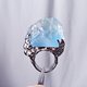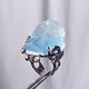 呼应蓝萤石的雪山风貌,戒台精工拉**海浪、祥云**型纹,镶制**立体、镂空**华美戒台(纯银镀白K金)、点缀**白锆石**拟**纷飞的雪花冰晶**,戒面下(**开窗**)可见本件蓝萤石之高透光感。