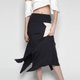 Description: Cut at a midi-length with colorblocked trim at its asymmetrical back and front overlay. Features vented front hem. Skirt is slightly rough thick and non-sheer, layered. Invisible side zipper closure. Fabric has slight stretch and fit runs small. Fabrication: Polyester blend Colour(s) Available: Black only. Care Content: Suitable for gentle hand wash in mild detergent, do not soak, bleach when necessary, hang dry, medium heat iron on reverse Designed in Singapore, made in Indonesia Fit Content: Soo is 178 cm tall and fits SALIENT LABEL SIZE 2. Sizes in chart are approximate measurements for fitting.