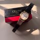 这枚Celine 圆形珍珠贝母手表设计优雅,表面采用珍珠贝母材质,在光线照射下会反射出多变的色彩,增添独特魅力。表盘以罗马数字标示时间,增添复古韵味。原装真皮Celine表带因使用时间较长,出现变浅色及轻微使用痕迹,但仍具质感,展现经典风范。