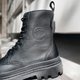 PALLADIUN 以都会样貌重新刻划经典PAMPA靴型推出全新PALLATROOPER, 同样采用轮胎橡胶大底,靴身从原本硬派线条,转化成优雅俐落的剪裁,同时结合摇滚元素,以不同质地的牛皮搭配车逢线、凸显法式军靴不失个性态度的经典。