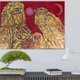 该艺术品描绘了三个人物——一个家庭群体——具有夸张的、类似猿猴或浓密鬃毛的特征,他们的形态由丰富的、有纹理的金黄色和棕色构成,暗示着野性、未驯服的品质。他们直视的、睁大的眼睛,以惊人的蓝色呈现,穿透画布,在强烈、火红的背景衬托下,放大了作品的情感冲击。一个神秘的粉红色球体漂浮在背景中,增添了神秘的气氛。博伊科巧妙地运用他标志性的朴素风格,超越了文字表现,提供了一种强大的、近图腾般的家庭纽带、本能和归属感的视角,所有这些都透过原始的艺术能量传达出来。