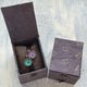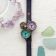 使用美丽的浅紫水晶和薄荷绿彩色玻璃,并搭配使用木板染色制成的印有暖色系的淡紫色圆形设计的牛皮表带。