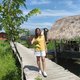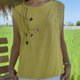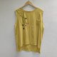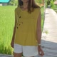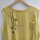 黄色无袖上衣,手工刺绣橙花和绿色三叶草叶。