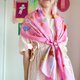 丝巾两头的图案是垂直铺排,垂下来可见所有饰物在前边;长度180cm,足够围住脖子绕一圈;丝巾质料是真丝,布料不厚也不薄~夏天到冷气开放的地方拿出来用,秋冬的时候也可以用上,实用又美丽。